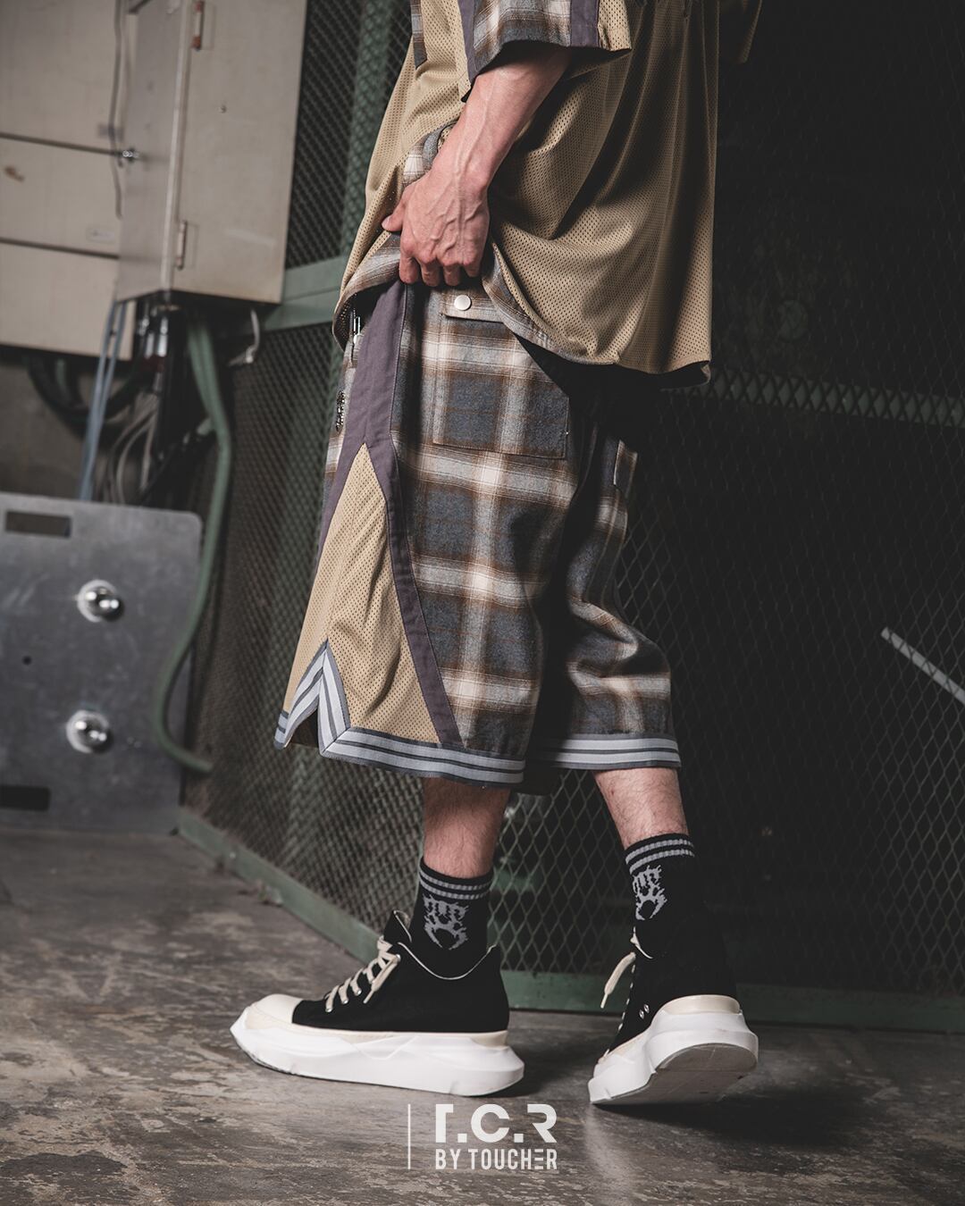 バスケットショーツの要素と現代的なエッセンスが融合した、ストリートウェアの概念を再定義する一本。大胆な異素材ミックスが魅力のこのショーツは、クラシックなチェック柄が目を引く上質なコットンとリネン素材を使用したパネルラインデザイン。サイドには、透け感がセンシュアルなメッシュ素材を大胆に配し、他に類を見ないユニークな表情を生み出しました。