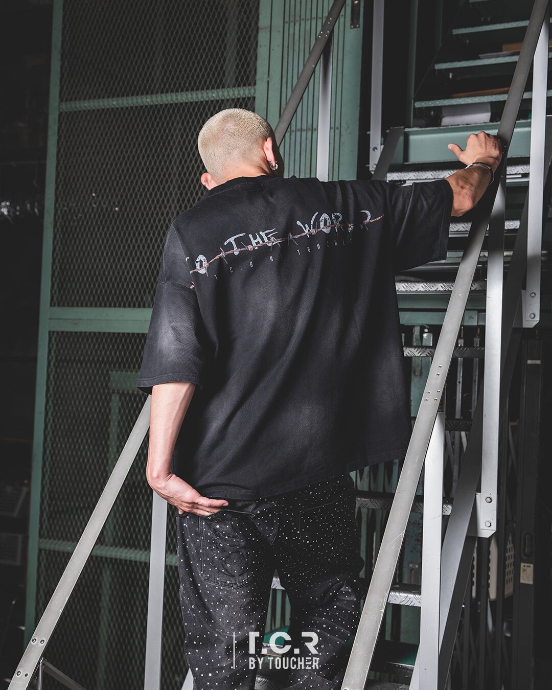 バックデザインには「TO THE WORLD」というメッセージが大胆にプリントされており、その下に小さく「T.C.R BY TOUCHER」の文字が添えられています。こちらもフロント同様、ウォッシュ加工とダメージ加工が施されており、一貫した世界観を表現しています。