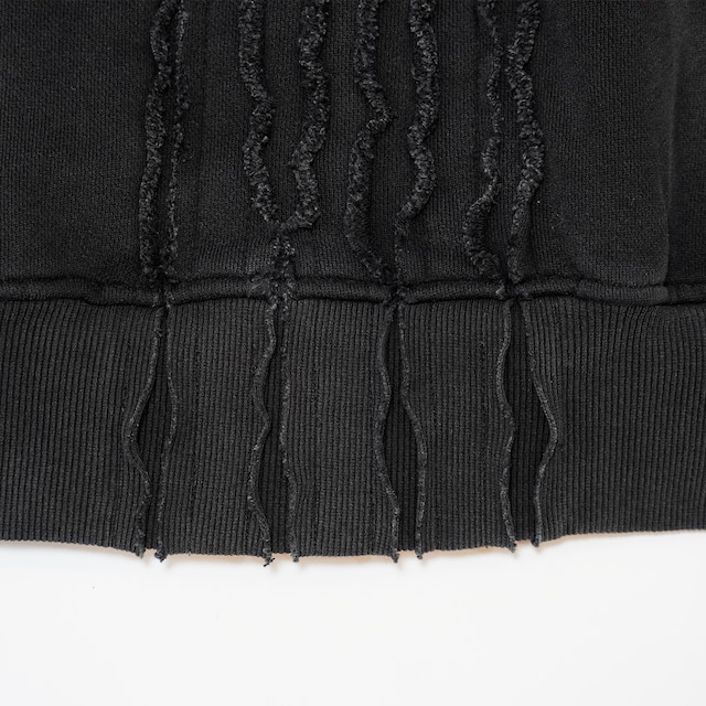 重厚感のあるブラックボディに、構築的なパネル切り替えと立体的な縫製ラインを施し、フーディという日常着をアウター級の存在感へと昇華させています。