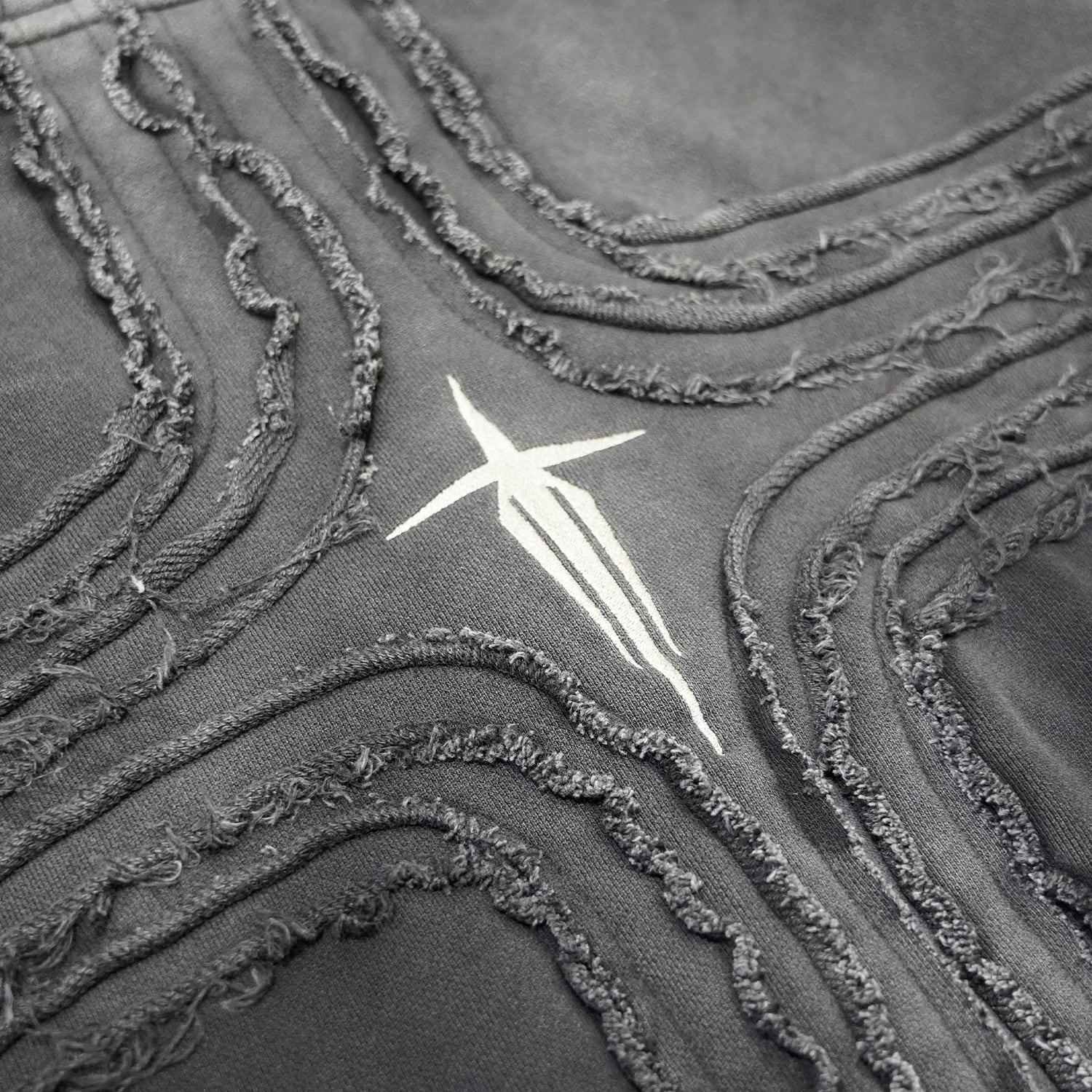 背面には、ブランドを象徴するクロス刺繍を中心に、レイヤー状のステッチワークをクロスフォルムで配置。