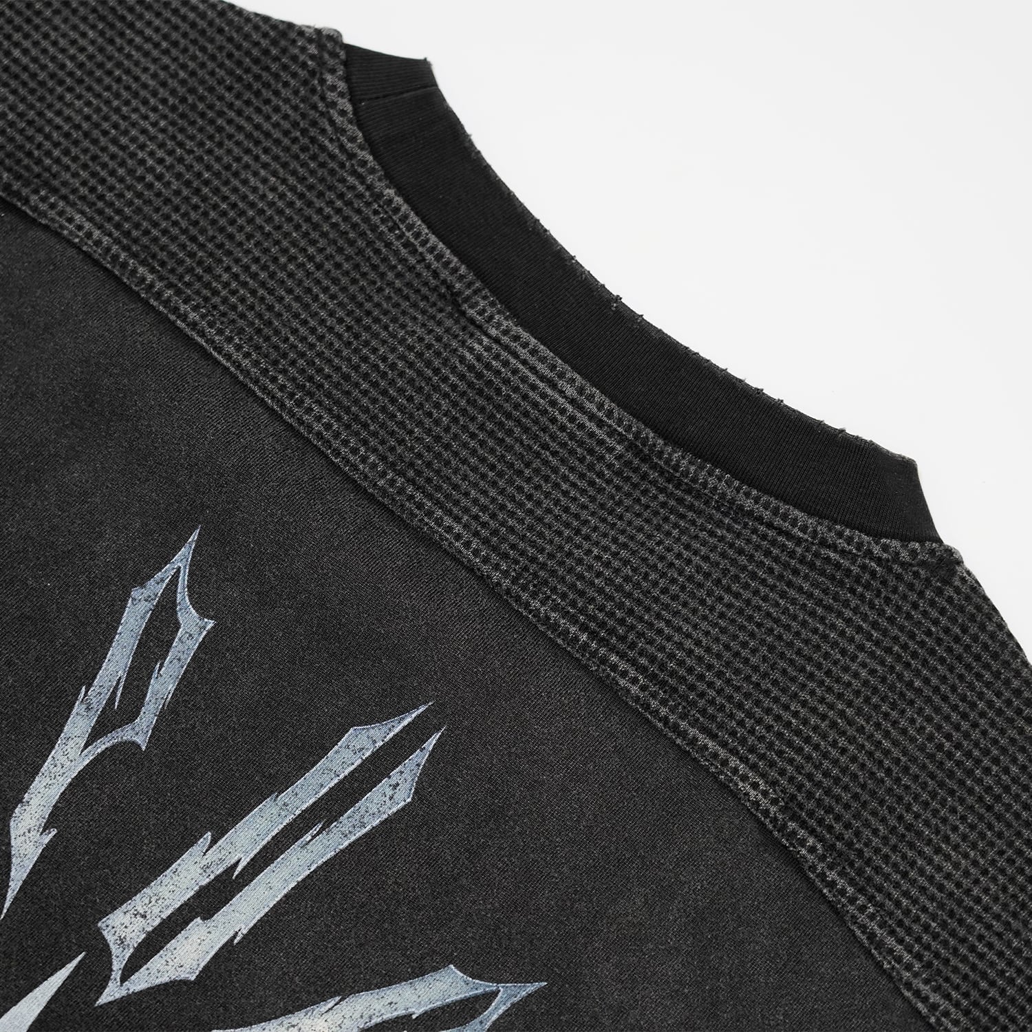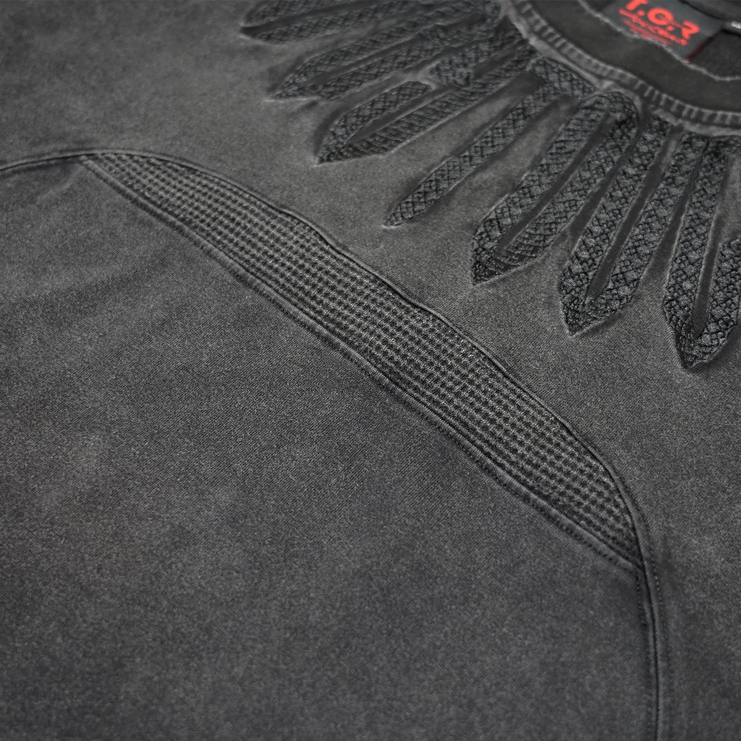 胸元と肩の切り替えにはサーマル生地が配置されウォッシュ加工によりコントラストを生む。