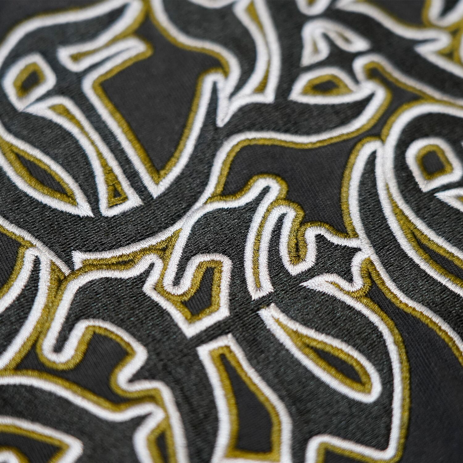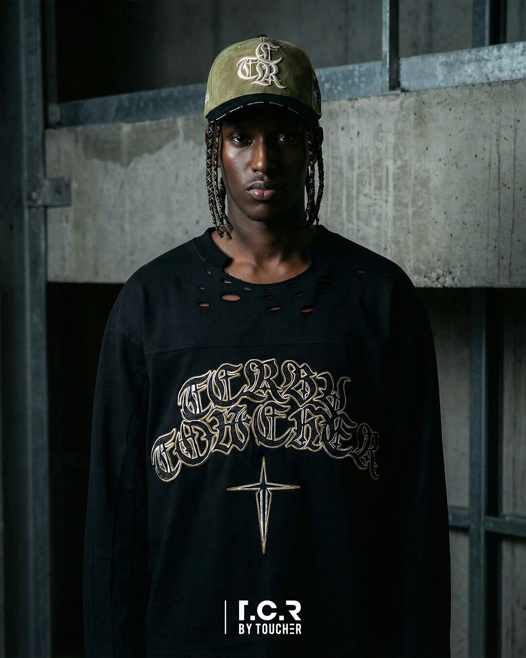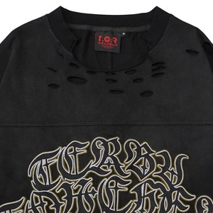 大胆なディストレスト加工(ダメージ加工)と、重厚な高密度刺繍が、他に類を見ないストリートゴシックなムードを演出。