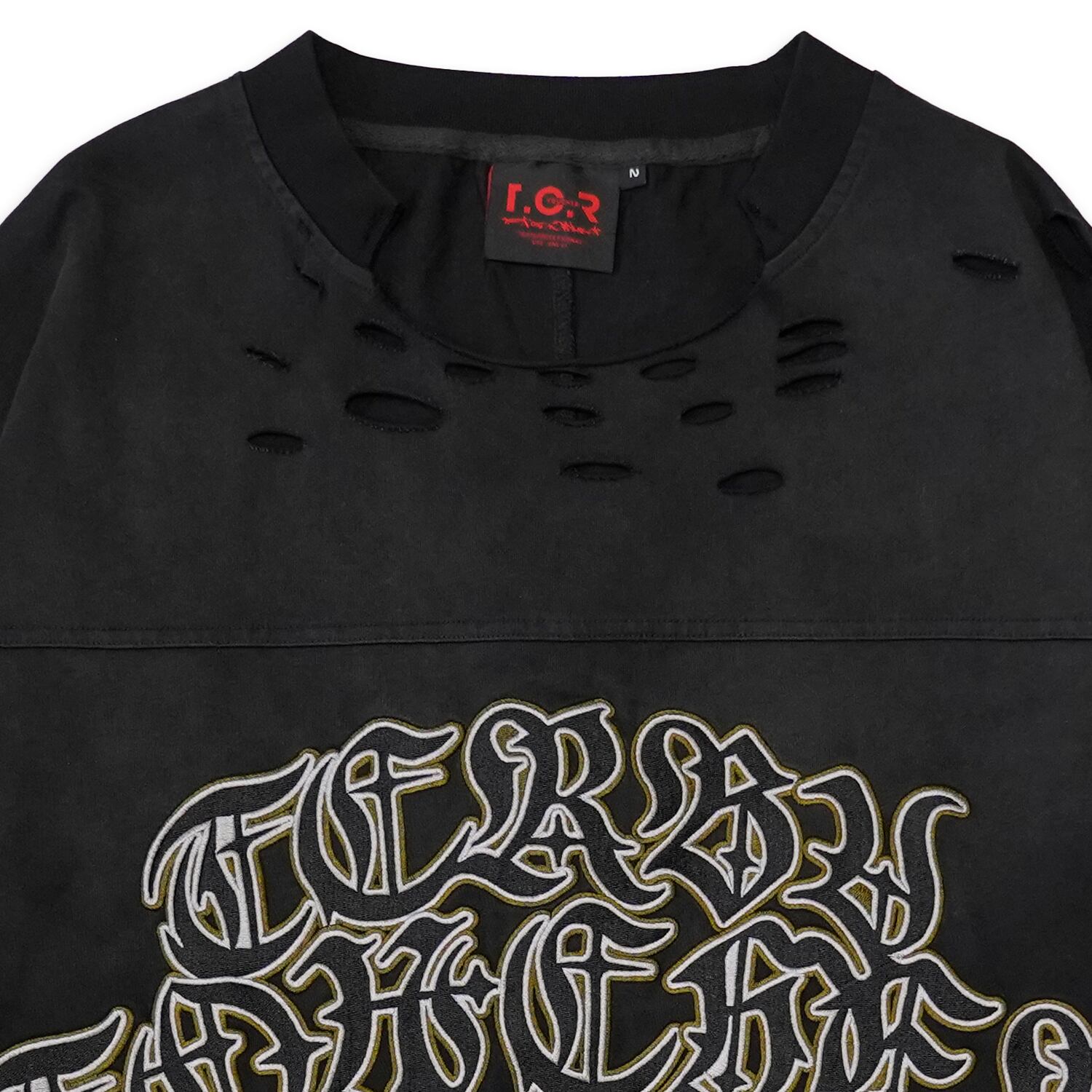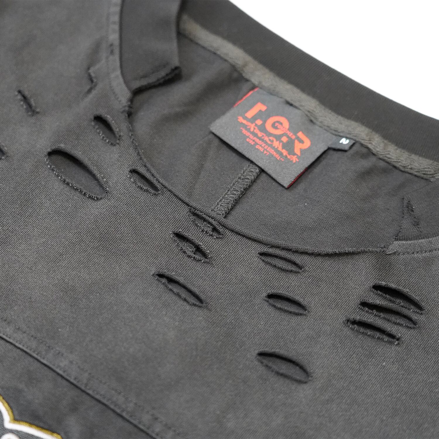 胸元には、クロスが組み込まれたオールドイングリッシュで描かれたT.C.Rロゴが鎮座。緻密な刺繍で表現されたロゴは、立体感と光沢感を放ち、強烈なインパクトを与えます。その下には、シャープなラインで描かれたT.C.Rクロスモチーフが配置され、さらに荘厳な雰囲気を高めています。