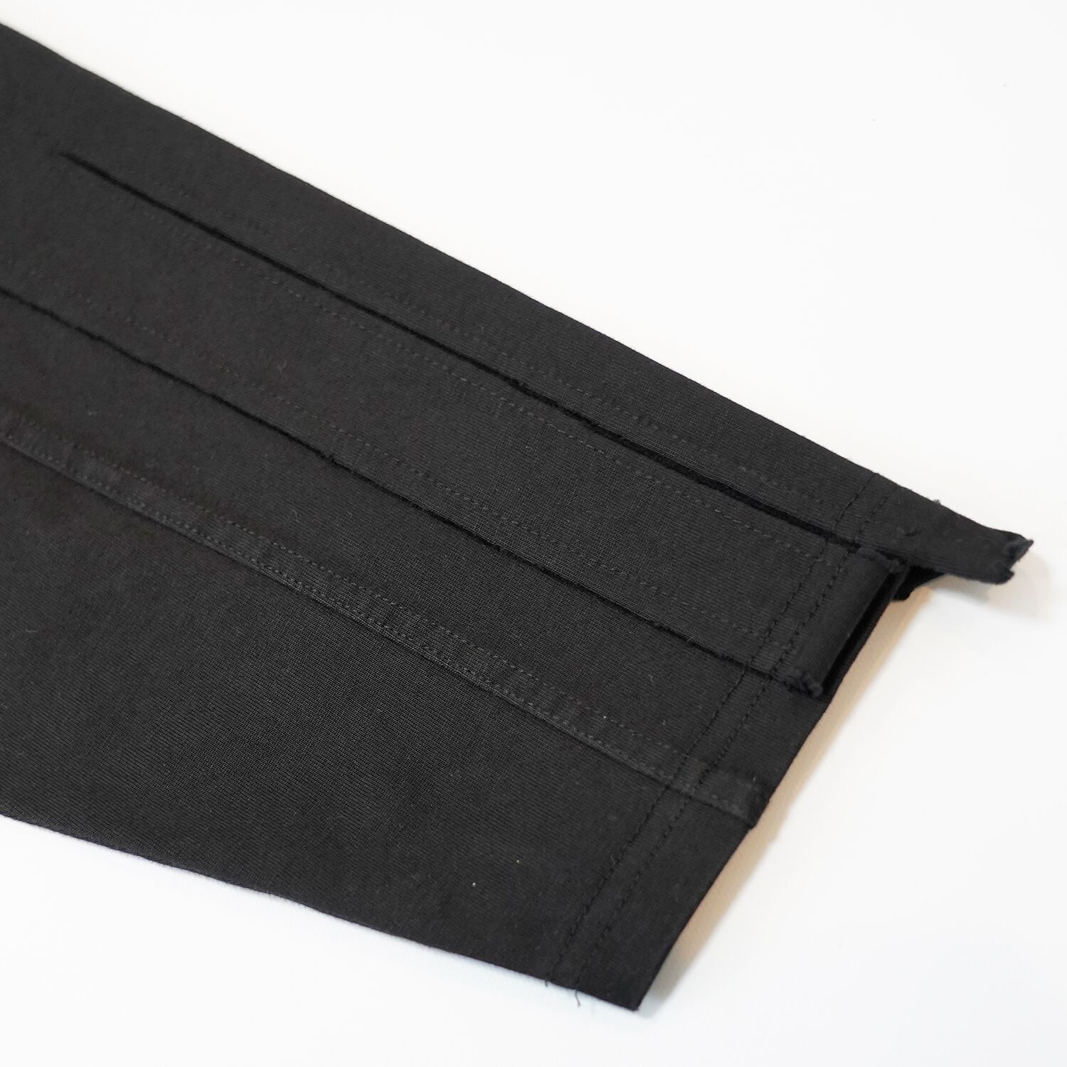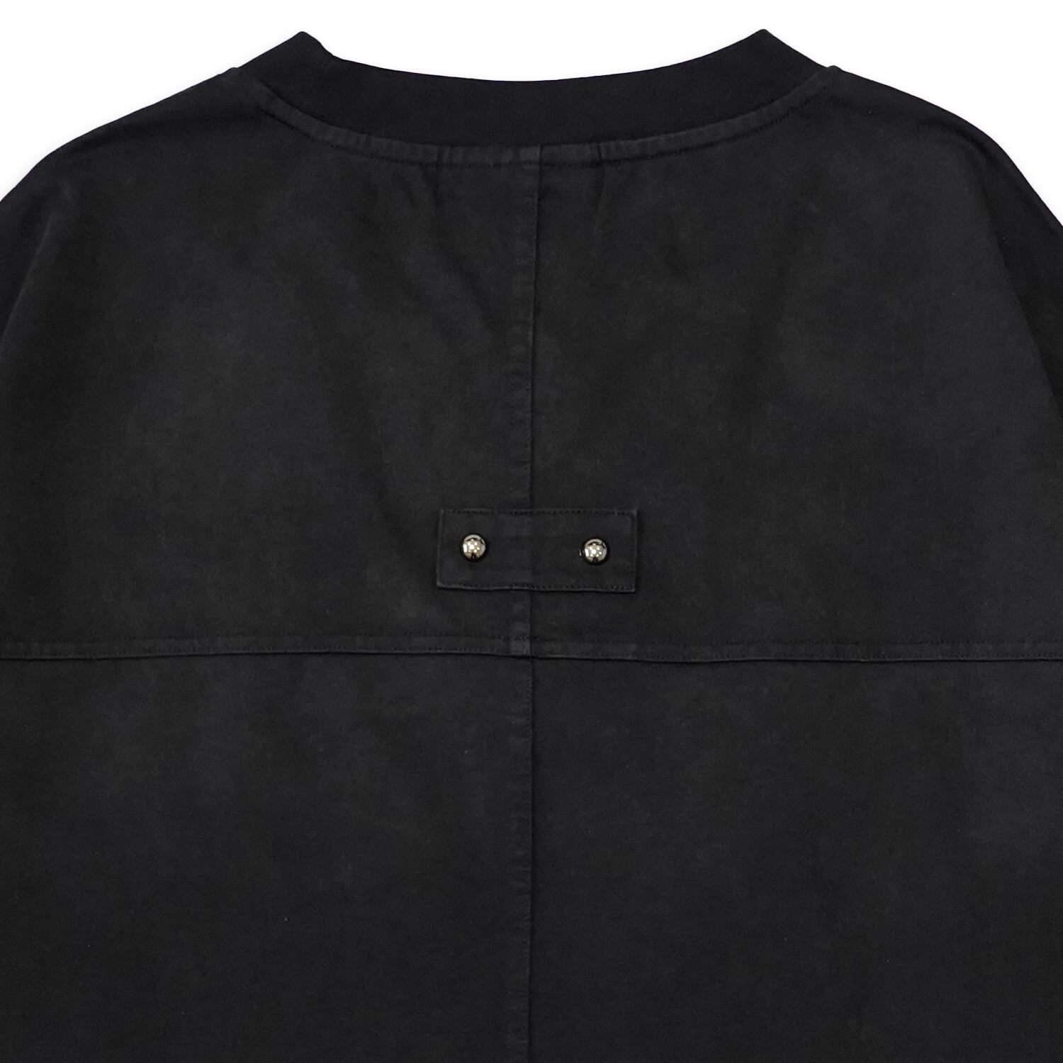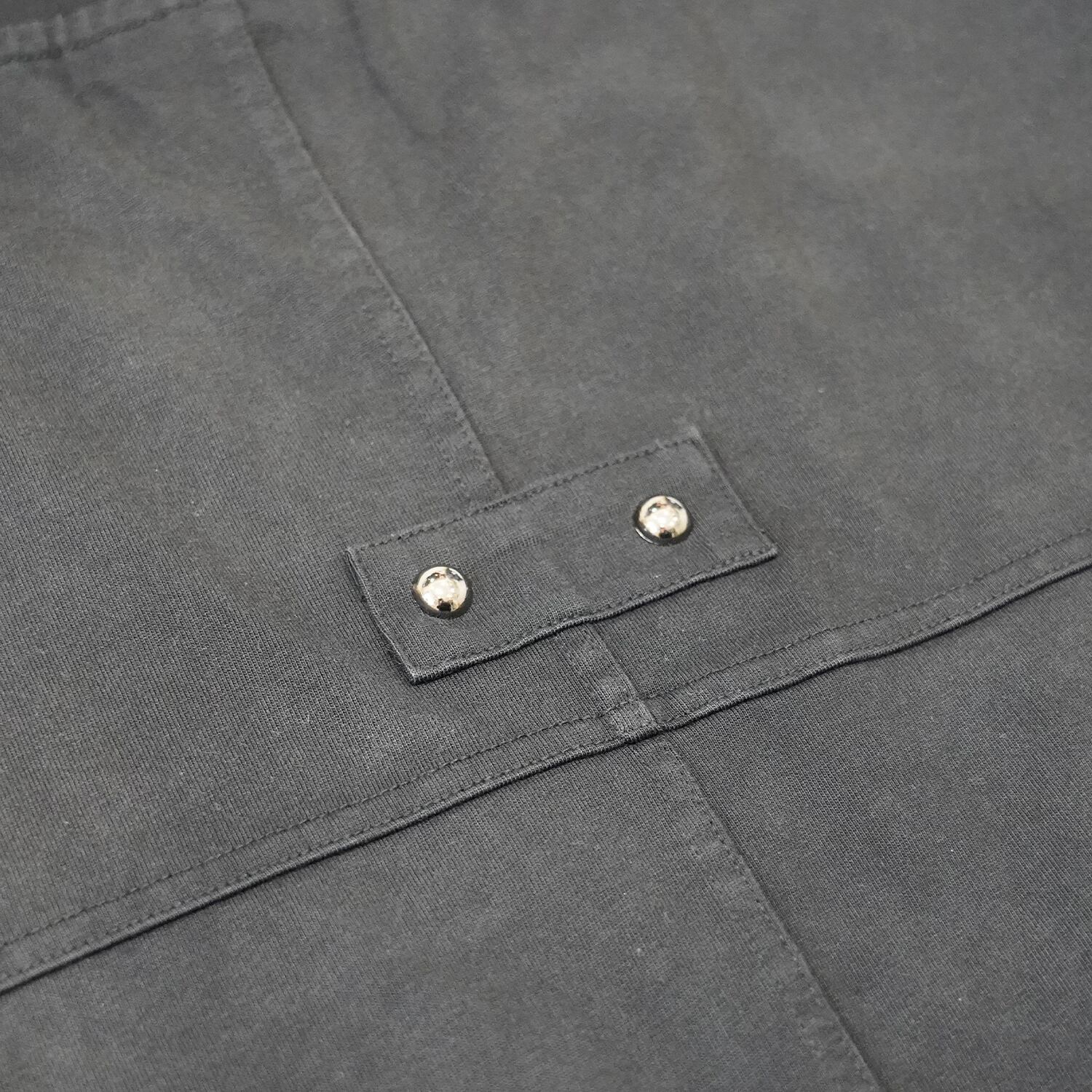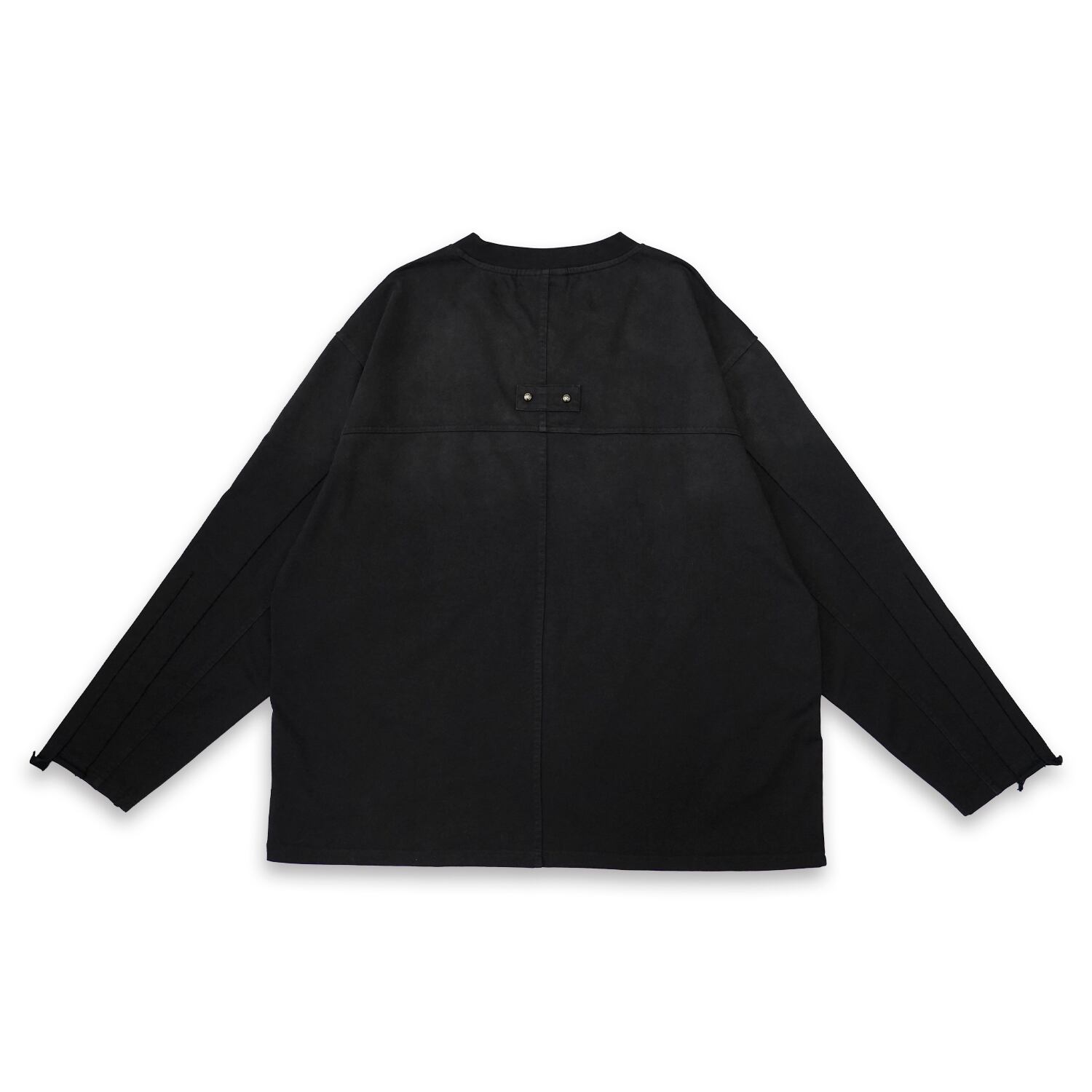 袖はスプライスパネルデザインを施し袖口は切りっぱなしのラフな処理が施されておりコントラストを生み出す、ディストレスト加工と相まって、より一層退廃的でクールな印象を与えます。