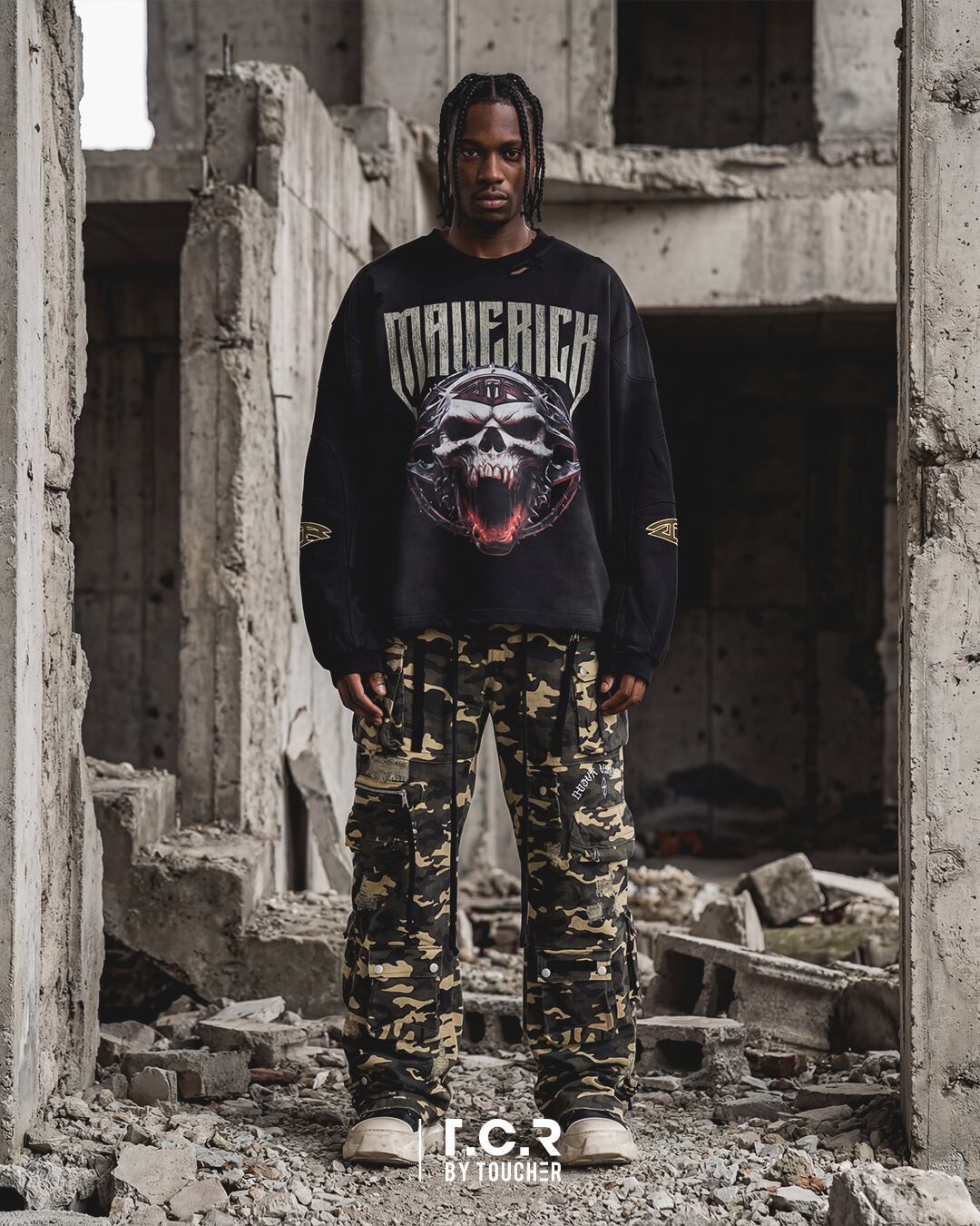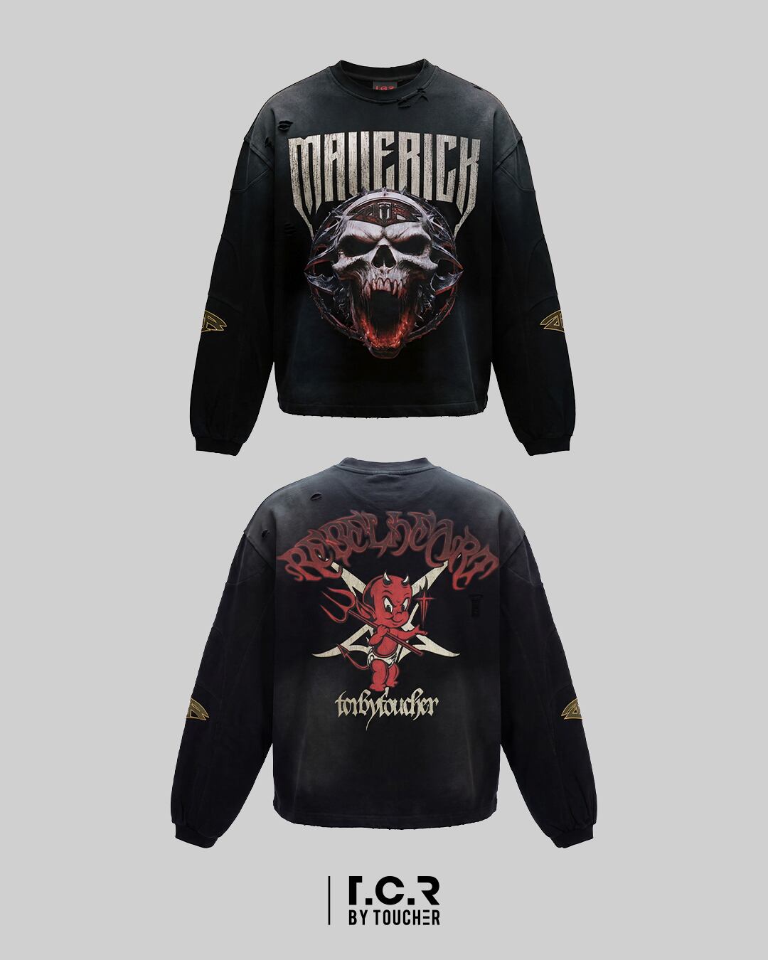 反骨、皮肉、ユーモアが交錯する表現が、T.C.R BY TOUCHER 独自の反体制的美学を体現し、フロントとは異なる感情のレイヤーを描き出すことで、着用者の内面に潜む二面性を可視化する。